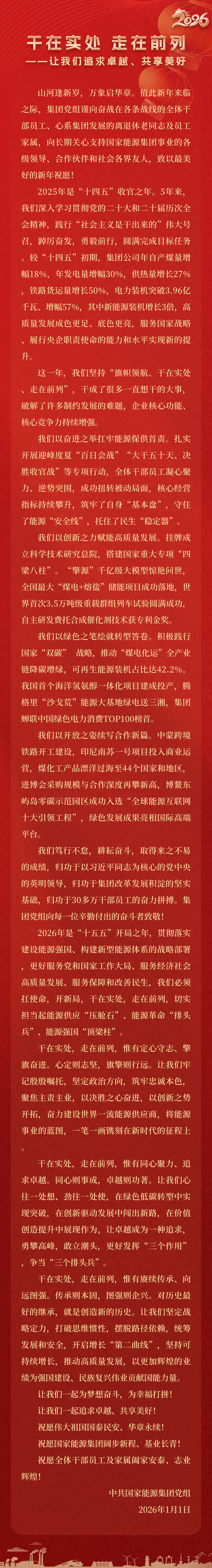 國家能源集團胸懷“國之大者”,增產增供、穩價穩市,積極服從服務國家戰略、保障國家能源安全、助力國民經濟穩增長,推動煤炭安全綠色智能、煤電清潔高效穩定、現代煤化工高端多元低碳、運輸物流協同一體、新能源多元創新規?;l展,全力擔當能源強國頂梁柱,能源供應壓艙石,能源革命排頭兵。